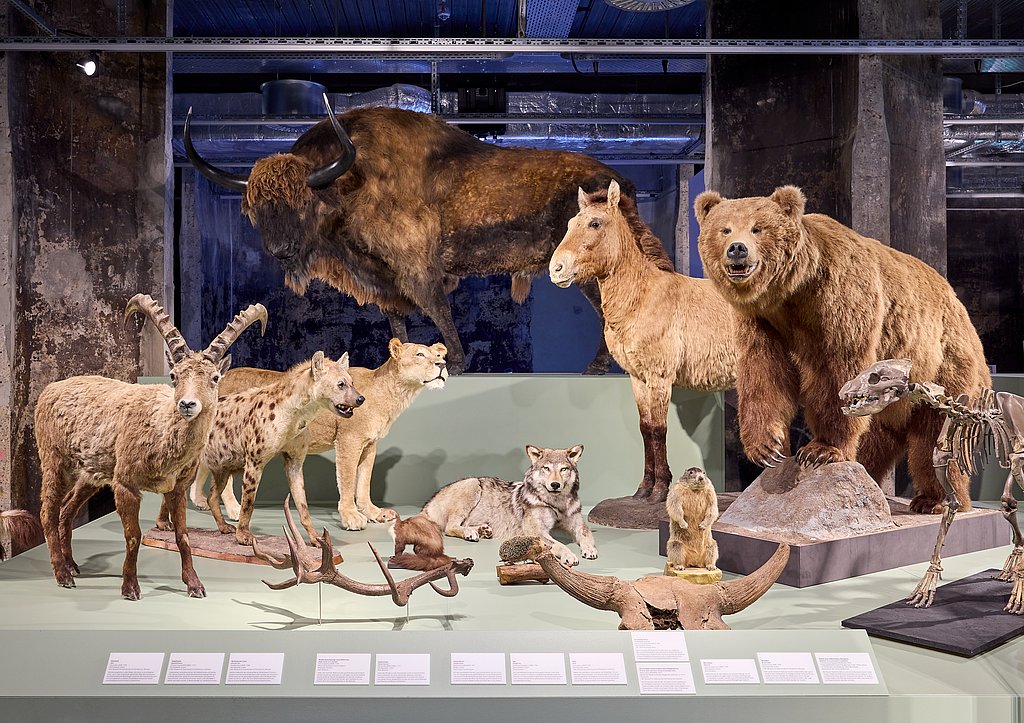 Im Mittelpunkt der Ausstellung steht eine beeindruckende Parade eiszeitlicher Tiere. Originale Knochenfunde, ganze Skelette, lebensechte Dermoplastiken und Modelle zeigen die Vielfalt und die Anpassung der Tiere an das Klima. Hier treffen das fellgeschützte Wollnashorn und das Mammut auf das wärmeliebende Waldnashorn und das Flusspferd, der Riesenhirsch auf die Höhlenhyäne. Der Wechsel der Klimaverhältnisse veränderte während des Eiszeitalters grundlegend den Lebensraum der Pflanzen und Tiere. Anpassen oder Ausweichen in andere Regionen waren Möglichkeiten, das Überleben der Spezies zu sichern. Viele Arten starben jedoch aus.